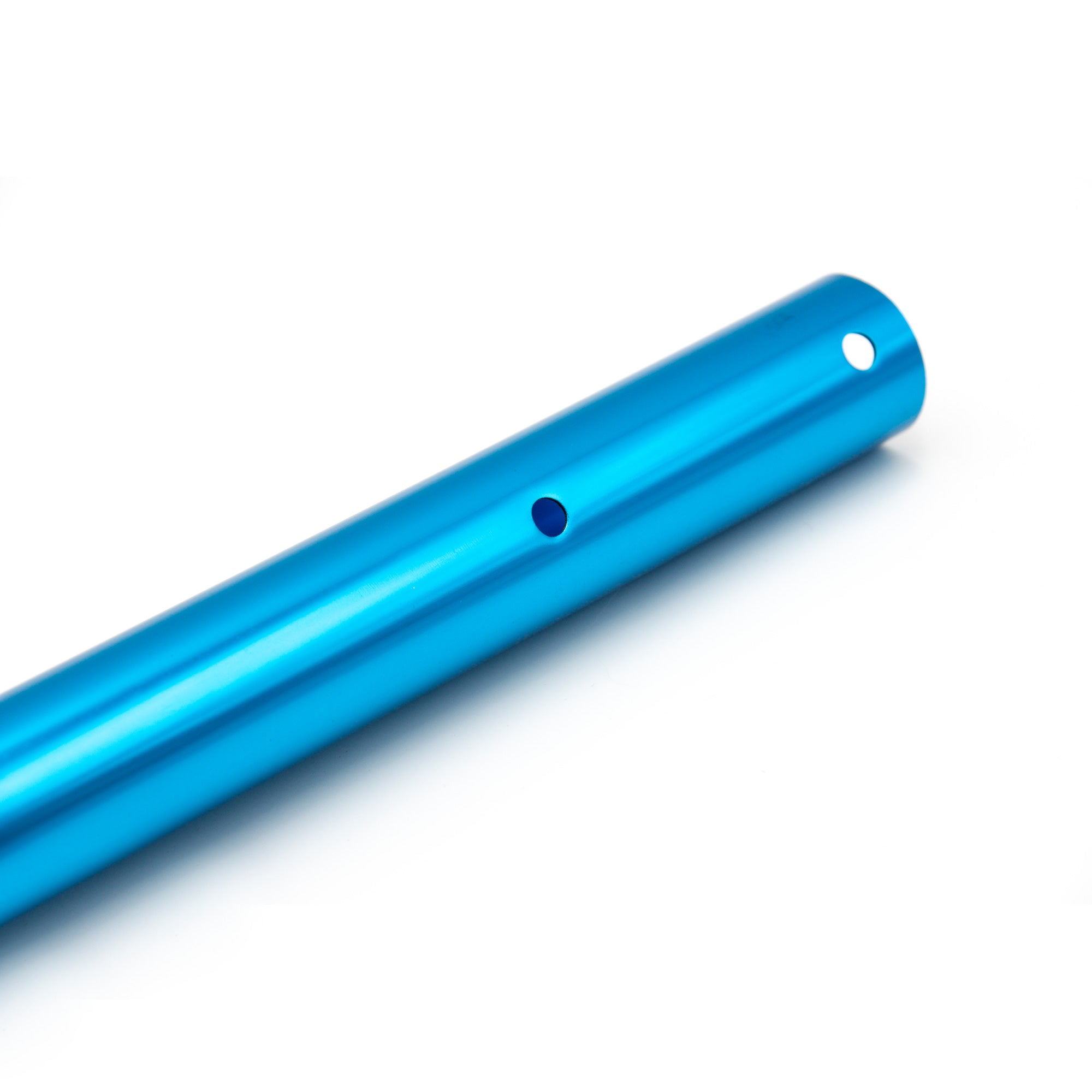 Die Längenverstellung erfolgt über zwei stabile Drehverschlüsse (Überwurfmuttern), mit denen sich die Stange sicher lösen und auf die gewünschte Länge einstellen lässt. Die Aluminiumkonstruktion bietet eine gute Balance aus Stabilität und Handlichkeit, während die silber-blaue Farbgebung für ein hochwertiges Erscheinungsbild sorgt.