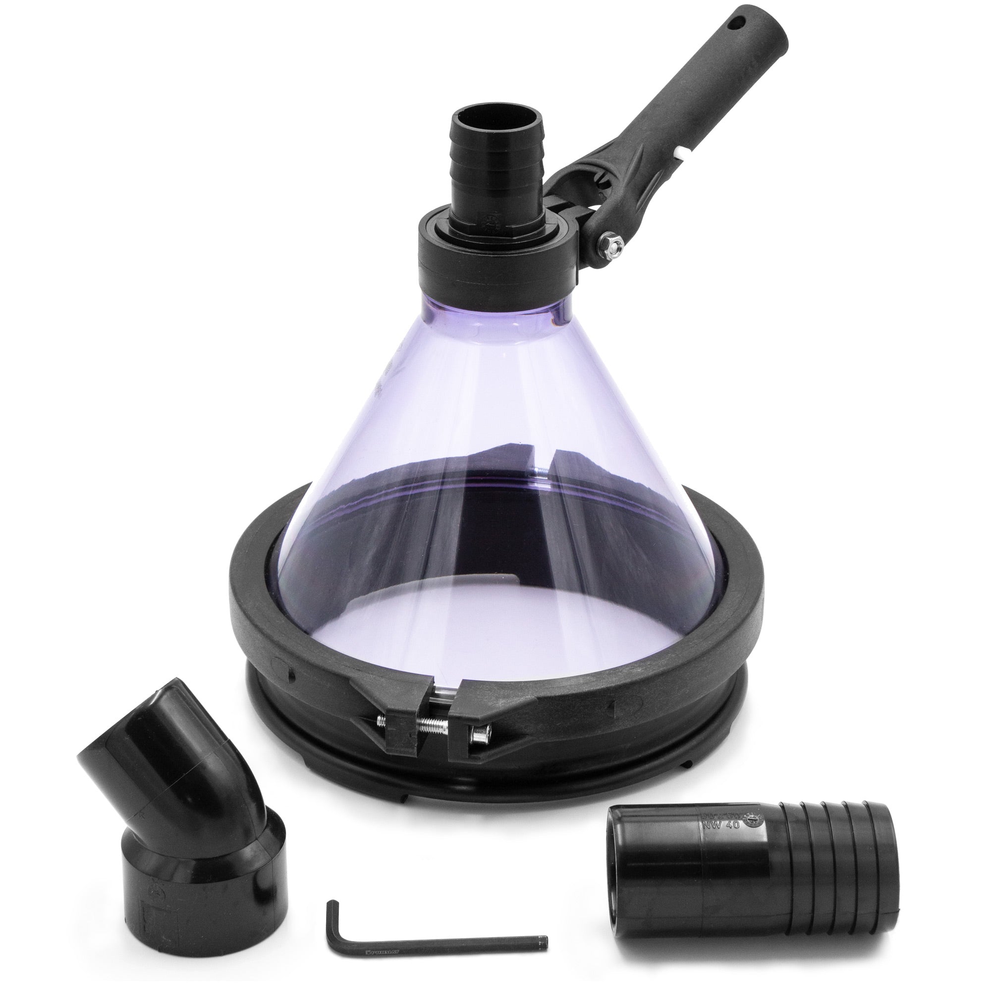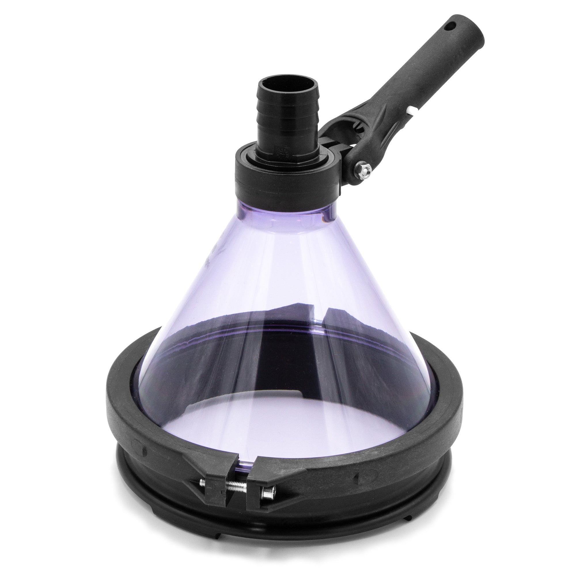 Die transparente Saugglocke aus unverwüstlichem Polycarbonat ermöglicht jederzeit Sichtkontrolle, während der hochfeste Adaptergriff aus Hochleistungspolyamid auch hohen Belastungen standhält. Der stufenförmig angelegte, auswechselbare Saugring sorgt für optimale Saugwirkung und schont gleichzeitig Teichfolie und Untergrund. Dank der 360° drehbaren und neigungsverstellbaren Griffaufnahme lässt sich der Mulmsauger präzise führen – auch in schwer zugänglichen Bereichen.
