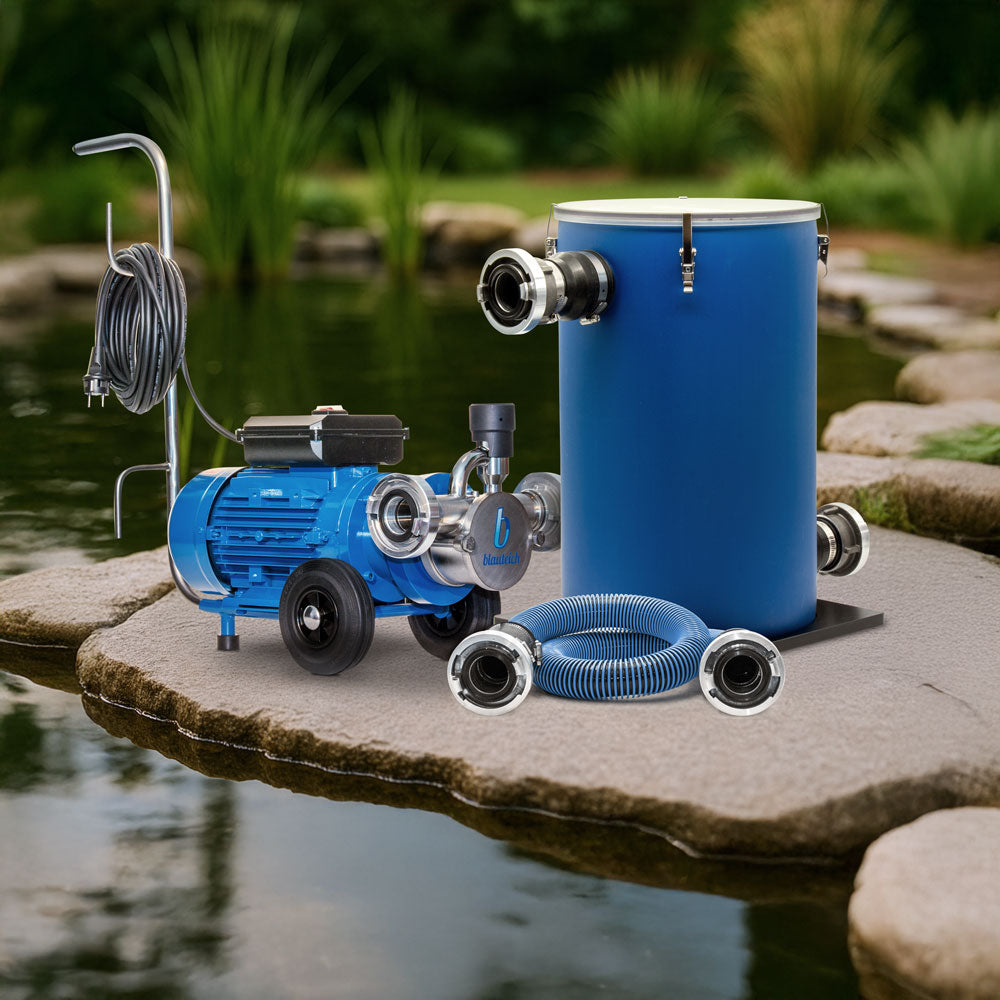 Für eine universelle und sichere Teichreinigung empfehlen wir dringend den Einsatz eines druckstabilen Vorfilters. Dieser schützt die Pumpe, hält grobe Bestandteile zurück und sorgt für einen gleichmäßigen, stabilen Arbeitsfluss – besonders bei höherer Schmutzlast.