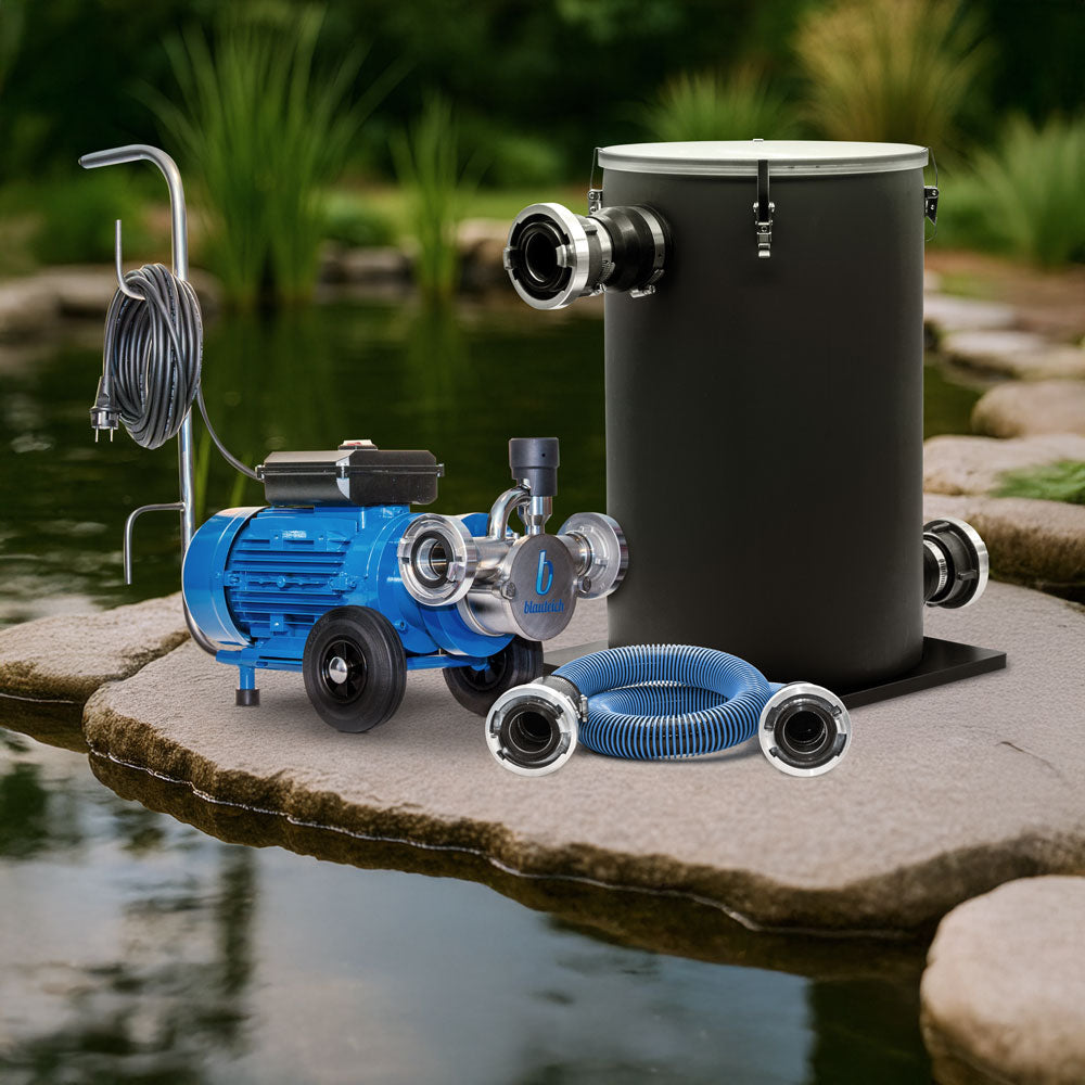 Das PRO XXXL Set ist bewusst so zusammengestellt, dass extreme Schlamm- und Laubmengen souverän bewältigt werden können. Kernstück ist der XXXL-Vorfilter mit 50 Liter Volumen, der deutlich längere Standzeiten ermöglicht und den leistungsstarken Impeller der Pumpe effektiv schützt. In Kombination mit der hohen Förderleistung des TS-12000 entsteht ein Arbeitsfluss, der auch bei großflächigen Teichen konstant bleibt.